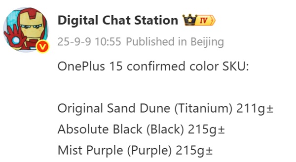 Un reputado informante, Digital Chat Station, reveló los nombres oficiales de los colores del cuerpo del OnePlus 15. El smartphone vendrá en versiones Original Sand Dune, Absolute Black y Mist Purple.