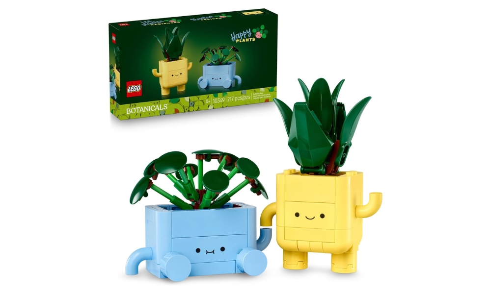 El LEGO Botanicals Happy Plants incluye 217 piezas para construir dos macetas con caras de dibujos animados. La dracaena bebé mide 7,5 cm de alto, mientras que la pilea bebé mide 7,5 cm. Las macetas amarilla y azul incluyen brazos posables que pueden cogerse de la mano. Las caras impresas evitan las pegatinas. Al levantar las plantas se descubren las diminutas raíces que hay debajo.