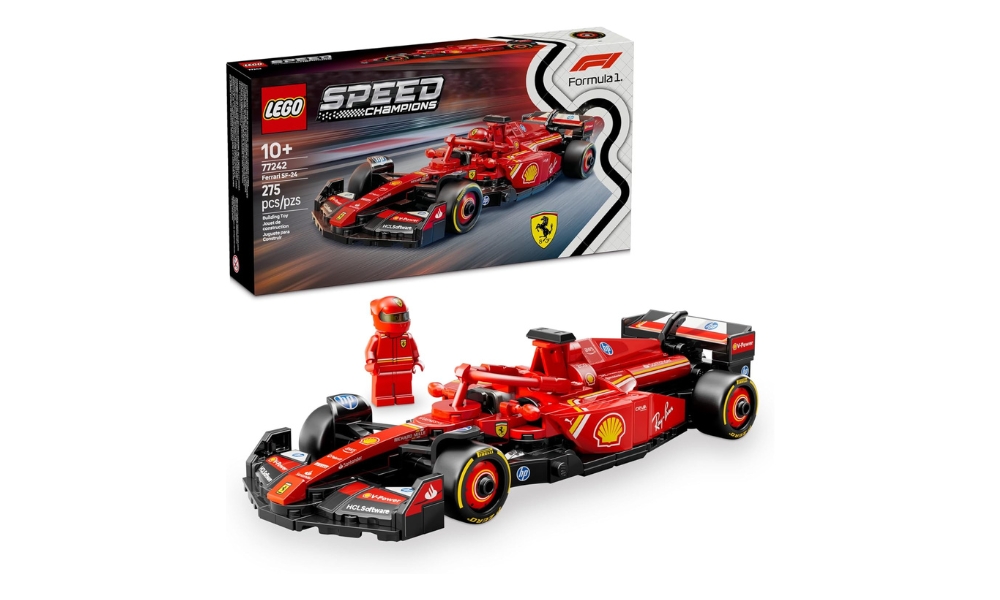El LEGO Speed Champions Ferrari SF-24 recrea el coche de Fórmula 1 de 2024 a escala de minifigura de 8 pulgadas. El set de 275 piezas reproduce la decoración roja de Ferrari con los logotipos de los patrocinadores, las alas aerodinámicas y el diseño de rueda abierta. El paquete se completa con una minifigura del piloto de carreras con traje y casco impresos. El tiempo de montaje es de 45-60 minutos.