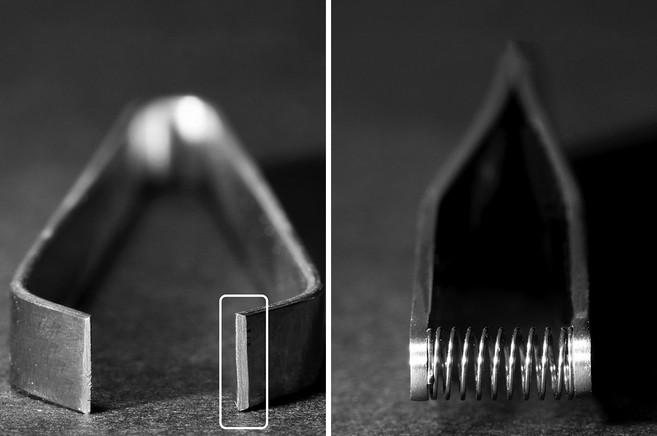 - El resorte de Nikken tiene una sección transversal cuadrada, lo que le permite sujetar los vellos con más fuerza para que no se resbalen del agarre de las pinzas al tirar