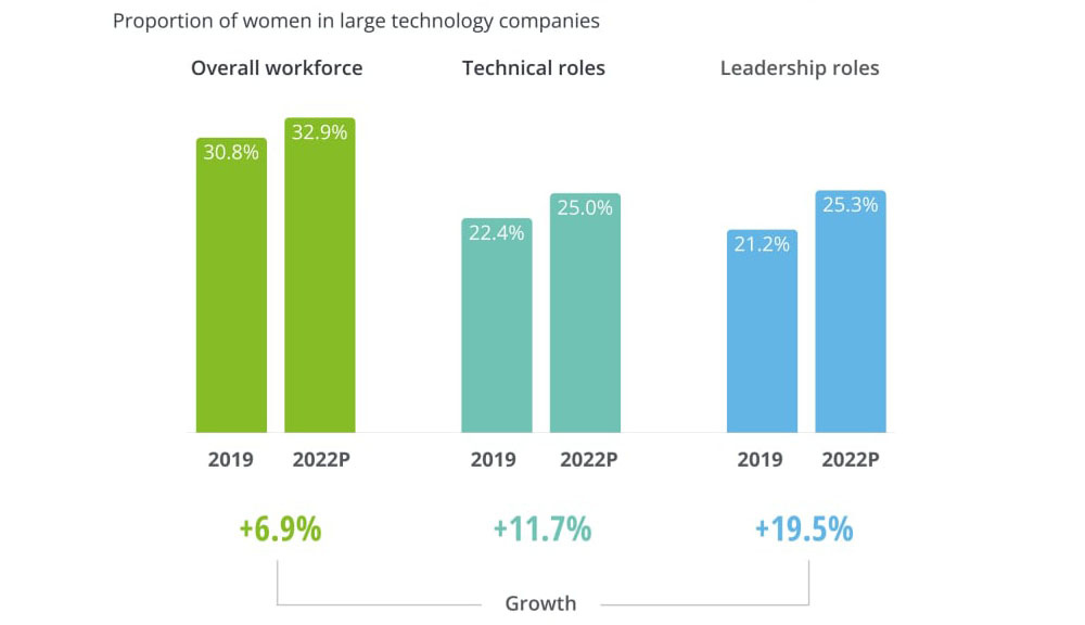 Mientras que el crecimiento general de mujeres en el lugar de trabajo fue del 6,9%, el crecimiento dentro de los roles de liderazgo fue del 19,5%.