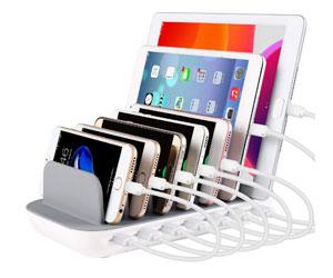 La estación de carga rápida SooPii para múltiples dispositivos es una excelente alternativa. Este equipo incluye 7 deflectores para teléfonos y tablets, 1 soporte de deflector para cargador de reloj, 8 cables de carga cortos (4 compatibles con lPhone y iPad, 2 Micro USB, 2 Tipo C); además, esta estación cuenta con Quick Charge 3.0 con un puerto que carga tu dispositivo 4 veces más rápido. Al cargar un dispositivo, los puertos del mamparo emiten una luz tenue y, cuando el dispositivo está completamente cargado, los puertos dejan de brillar. También es posible apagar y encender la estación de carga con un botón en el panel lateral; sin parpadeo ni ruido adicional.