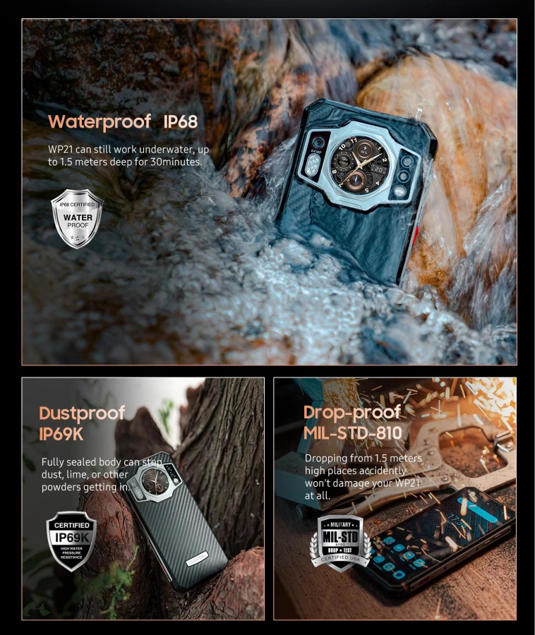 El dispositivo fue nombrado Oukitel WP21. El smartphone ha recibido un cuerpo con protección MIL-STD-810H e IP68/IP69K. Es decir, no tiene miedo al agua, así como a las bajas/altas temperaturas y a las caídas desde una pequeña altura. La novedad sigue contando con dos pantallas. La principal tiene un panel de 6,78 pulgadas con una tasa de refresco de 120 Hz y una resolución FHD+. En la parte trasera del dispositivo se ha instalado una pantalla circular adicional. Es compatible con la función AoD y muestra la hora y las notificaciones. También puede utilizarse como visor de la cámara principal. Aquí es un triple con 64 MP (Sony IMX686) + 20 MP (sensor de visión nocturna) + 2 MP (macro).