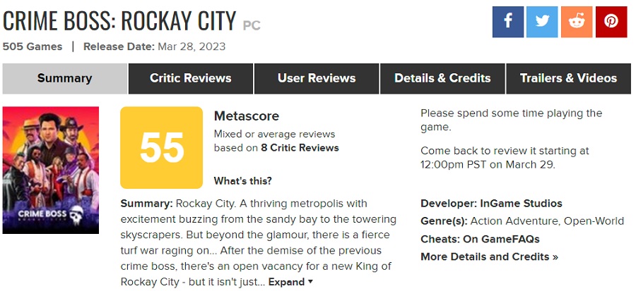 Los críticos señalan que los desarrolladores de Crime Boss: Rockay City tenían algunas buenas ideas, pero no fueron capaces de poner en práctica ninguna de ellas al nivel adecuado. El juego no se califica de fracaso, sino de mediocre (no sabemos qué es peor).
