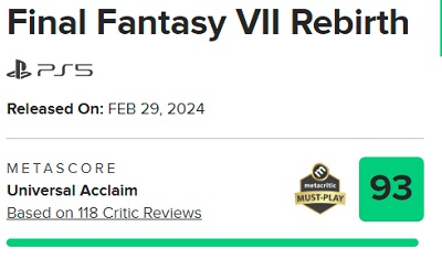 Esto sitúa al nuevo juego de Square Enix en el segundo puesto de Metacritic entre los juegos de la serie, solo por detrás de Final Fantasy IX, que tiene una puntuación más.