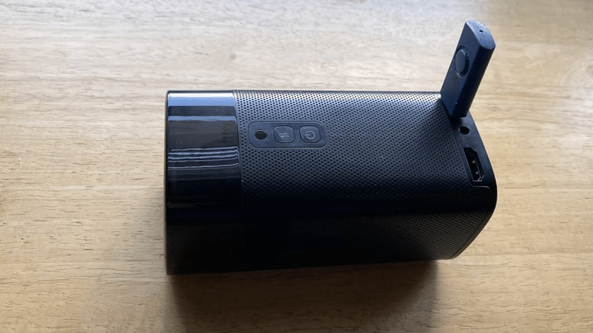 El Freestyle, en cambio, tiene un diseño cilíndrico único con la lente en el lateral. El cabezal del proyector puede girar 180 grados, lo que permite orientar la imagen hacia arriba, hacia abajo o hacia cualquier punto intermedio. Es un poco más grande y pesado que el Apollo, con 6,8 x 3,7 x 3,7 pulgadas y 1,8 libras, pero sigue siendo muy portátil. El soporte ajustable en ángulo incluido también es un buen detalle para colocarlo sobre una mesa.