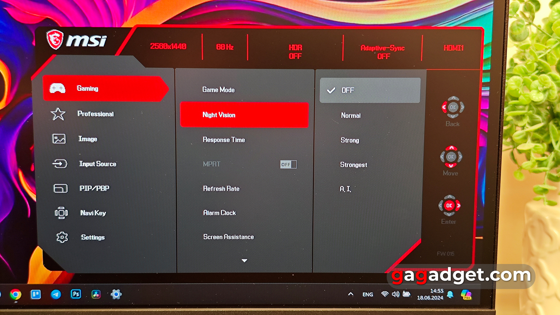 MSI G274QPF E2 menú de la pantalla es bastante familiar y conveniente. Todos los ajustes se dividen en varias secciones. En la primera sección Gaming hay una selección de modos de vídeo, Visión nocturna (retroiluminación de las partes oscuras de la imagen), Sincronización adaptativa, overclocking de matriz (Tiempo de respuesta), contador de velocidad de fotogramas en pantalla, etc. En la sección Profesional hay modos adicionales de visualización del color, reducción del azul, función de mejora de la imagen y selección de la gama de colores de la pantalla. La sección Imagen se encarga del ajuste manual del brillo, el contraste y la temperatura de color. La sección Fuente de entrada se encarga de seleccionar la fuente de señal: hay conmutación automática o manual. PIP/PBP - ajuste de los modos de imagen en imagen. Navi Key - ajuste de las funciones rápidas al desviar el joystick. Ajustes - ajustes del sistema: idioma y transparencia de los menús, ajustes de los indicadores LED, retroiluminación, HDMI CEC, ajustes de reinicio, etc.
