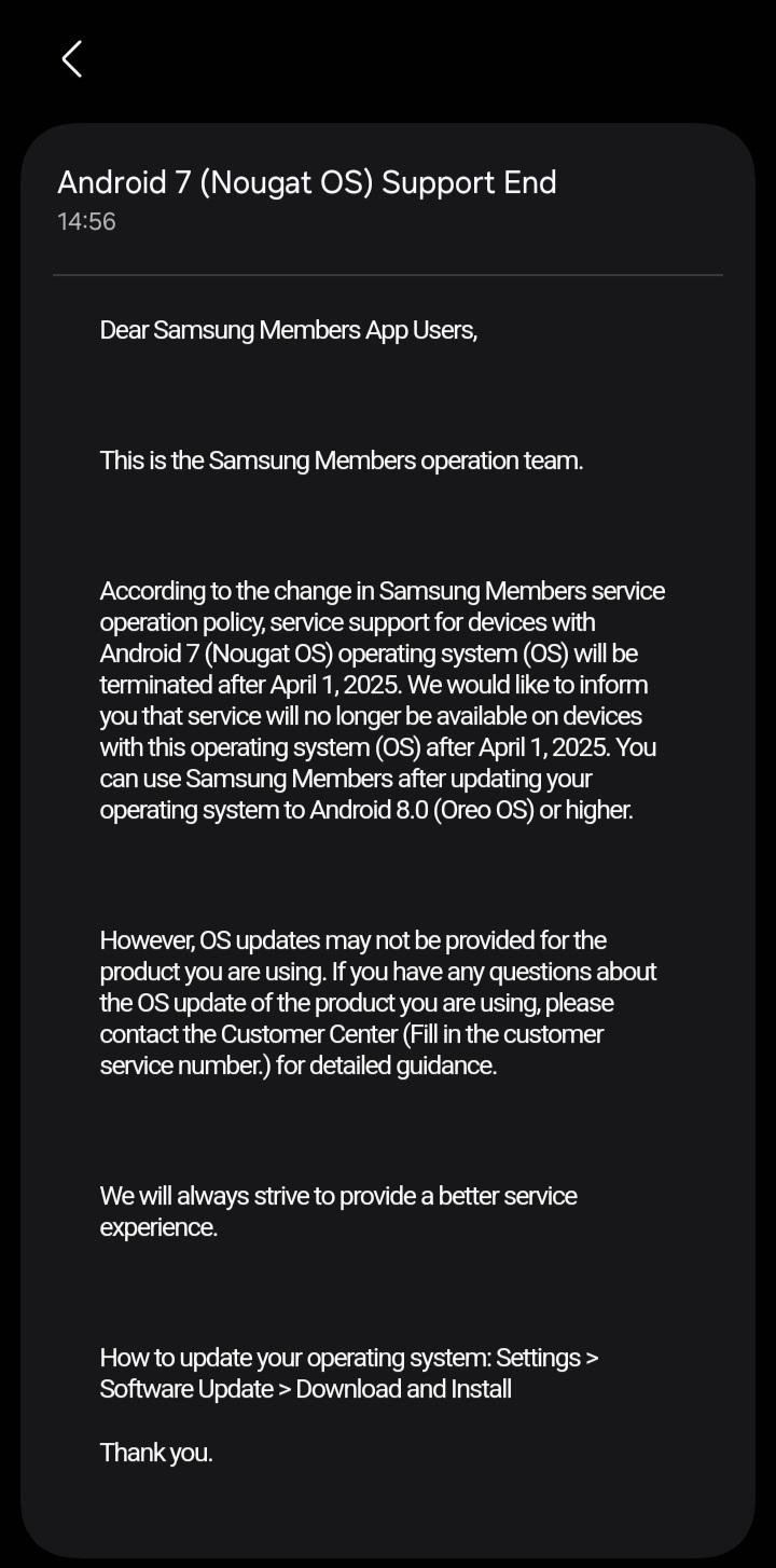 Samsung ha notificado a los usuarios de dispositivos Galaxy con Android 7 Nougat que la aplicación Samsung Members dejará de funcionar. A partir del 1 de abril de 2025, el servicio dejará de estar disponible en estos dispositivos.