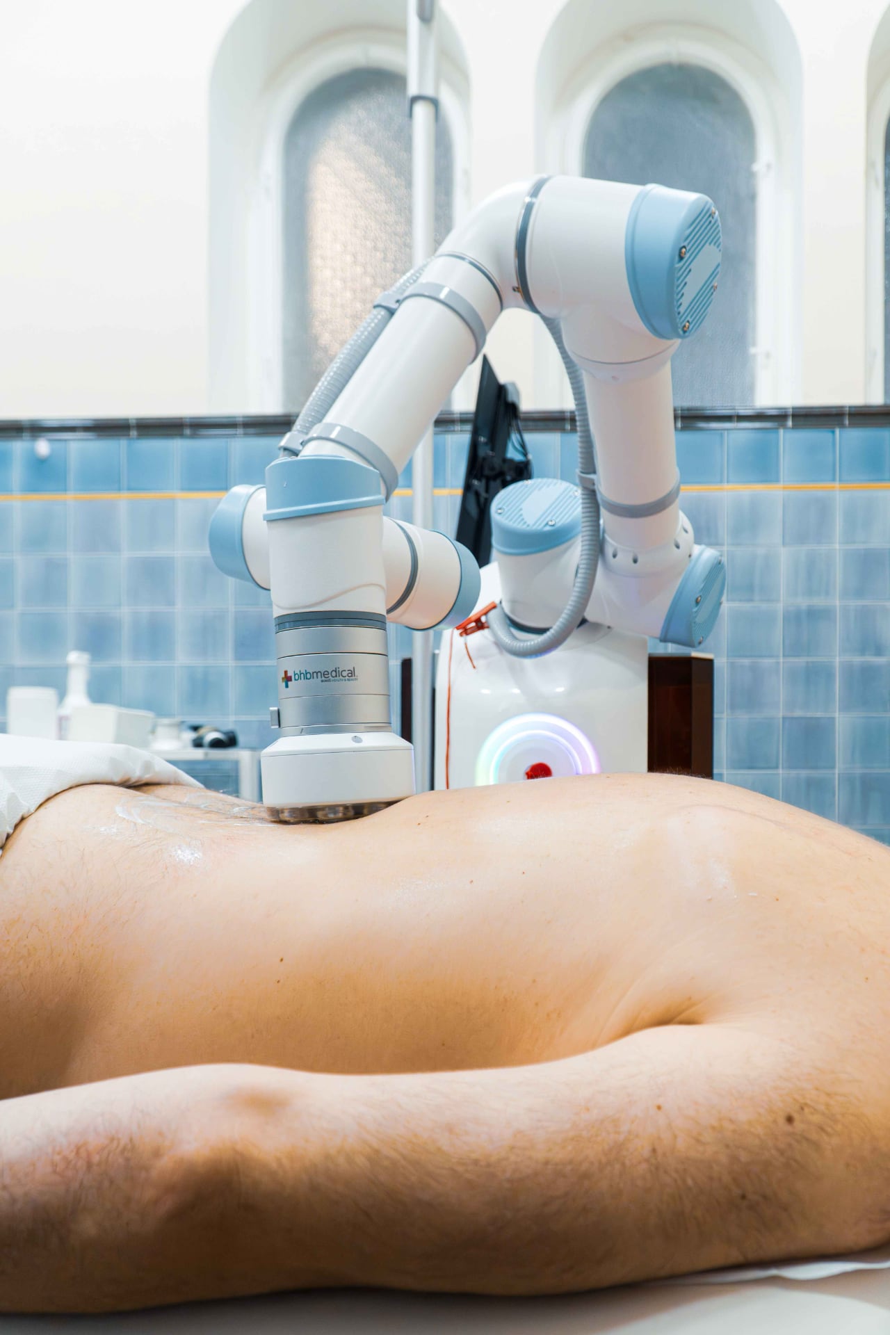 El robot Rocozyer (el nombre suena a anuncio de mantas suaves, pero déjalo) sabe combinar lo clásico con la tecnología: masajea mecánicamente y luego activa la terapia de ondas de radio. Es como un dos en uno: relaja los músculos y aporta colágeno. También tensa la piel. Al menos eso dice el fisioterapeuta jefe de Ensana, Dominik Mach.