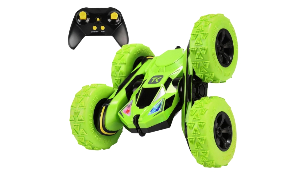 El Threeking RC Stunt Car está dirigido a niños y entusiastas ocasionales de RC con un diseño de doble cara que permite volteretas y conducción invertida. El coche mide aproximadamente 7-8 pulgadas de largo con ruedas de gran tamaño y suspensión flexible de manejo de ambas orientaciones. Los motores dobles accionan juegos de ruedas independientes que permiten giros de 360 grados, volteretas y conducción lateral. El mando a distancia de 2,4 GHz funciona a distancias de hasta 30 metros.