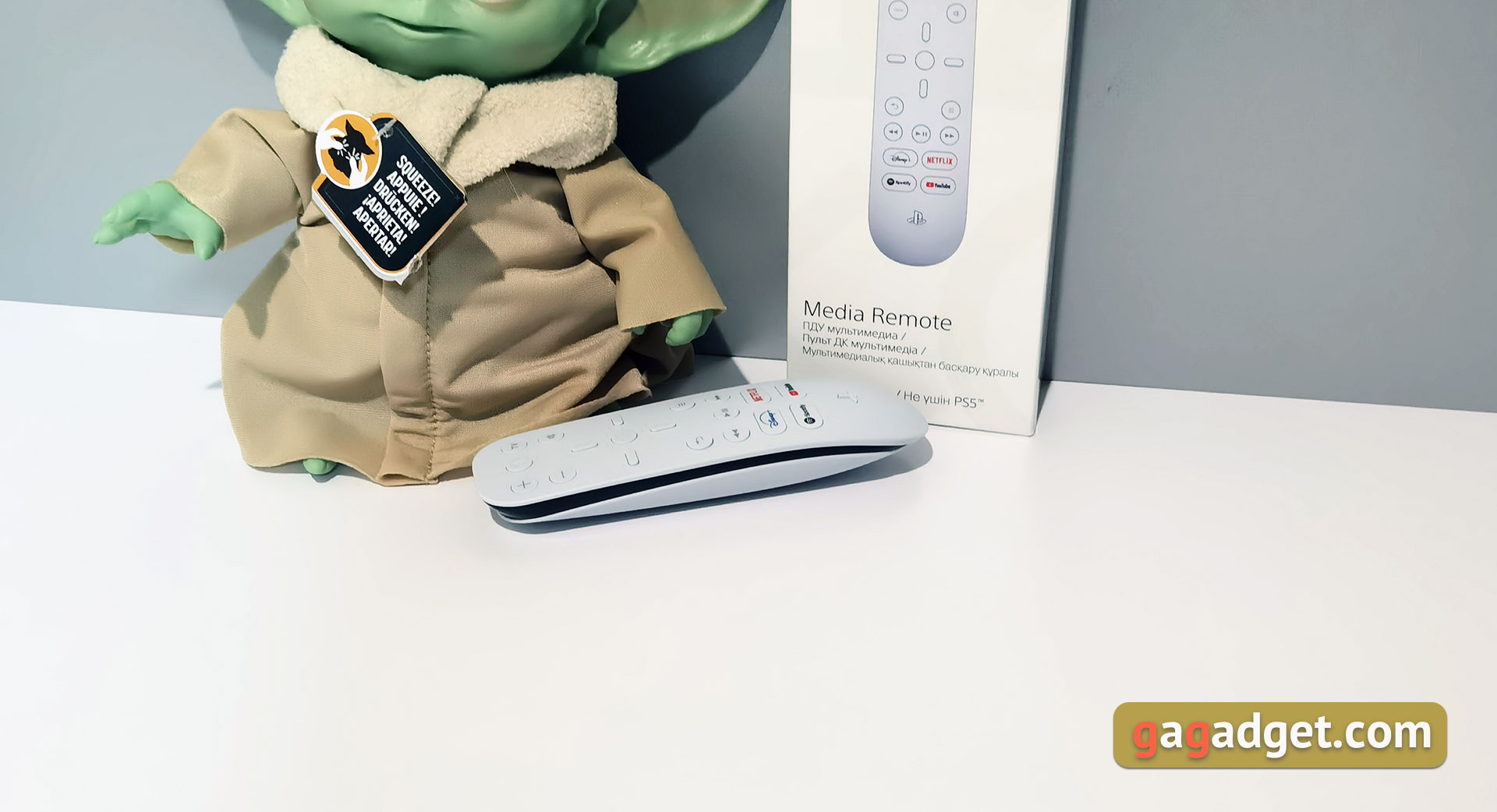 El conjunto de controles es similar a los mandos a distancia de la televisión. En la parte superior hay un bloque de cinco botones: control de volumen, encendido del televisor, silencio y un botón de micrófono. Hasta ahora, no funciona. Lo más probable es que la compatibilidad con la búsqueda por voz aún no se haya lanzado en Ucrania. A continuación se muestra el cuadro de navegación con el botón OK en el centro. Debajo de ella están los botones de retorno y de menú y los botones de control de la reproducción. Incluso más abajo, hay cuatro botones de inicio rápido para servicios de streaming populares: Netflix, YouTube, Spotify y Disney+. Esto último, por desgracia, no funciona todavía en nuestro país. El Media Remote resultó ser una función bastante práctica, pero no podemos decir que sea vital para cualquier propietario de PlayStation 5. Pero para los que utilizan constantemente su consola para los medios de comunicación, mucho. El mando cuesta 890 UAH.