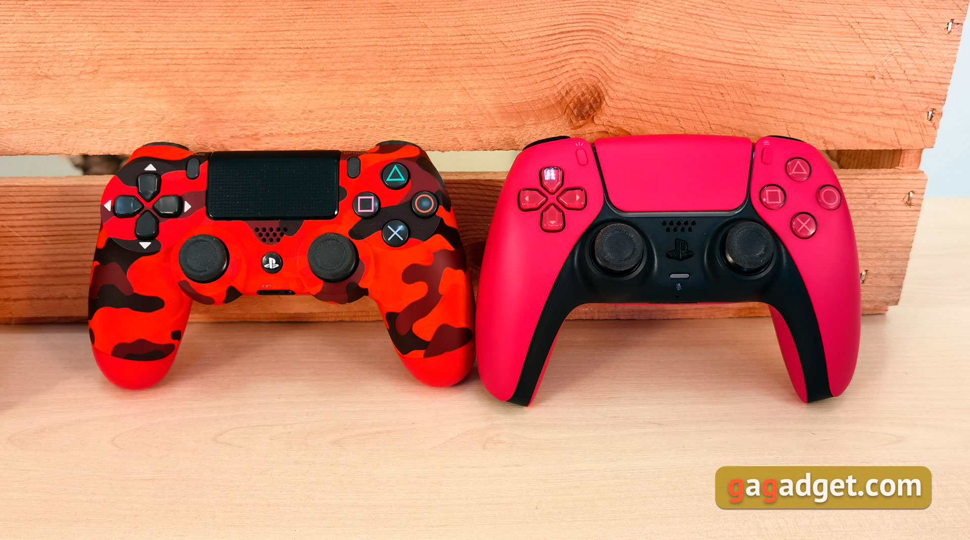 Ambas tienen un aspecto muy estético, pero el rojo espacial es el más original. El color es difícil de describir. Con distinta luz pasa a tonos cereza y burdeos o a rosa. Tiene un aspecto muy inusual, aunque a veces te sorprendes pensando que en la vida real el color es un poco diferente al de los renders oficiales. Estructuralmente, todo sigue igual: en lugar de elementos blancos hay rojos. Quizá en el futuro veamos algunas variantes con la parte inferior negra del gamepad de otro color. En la galería de abajo puedes compararlo con el DualShock 4 Camo Red.