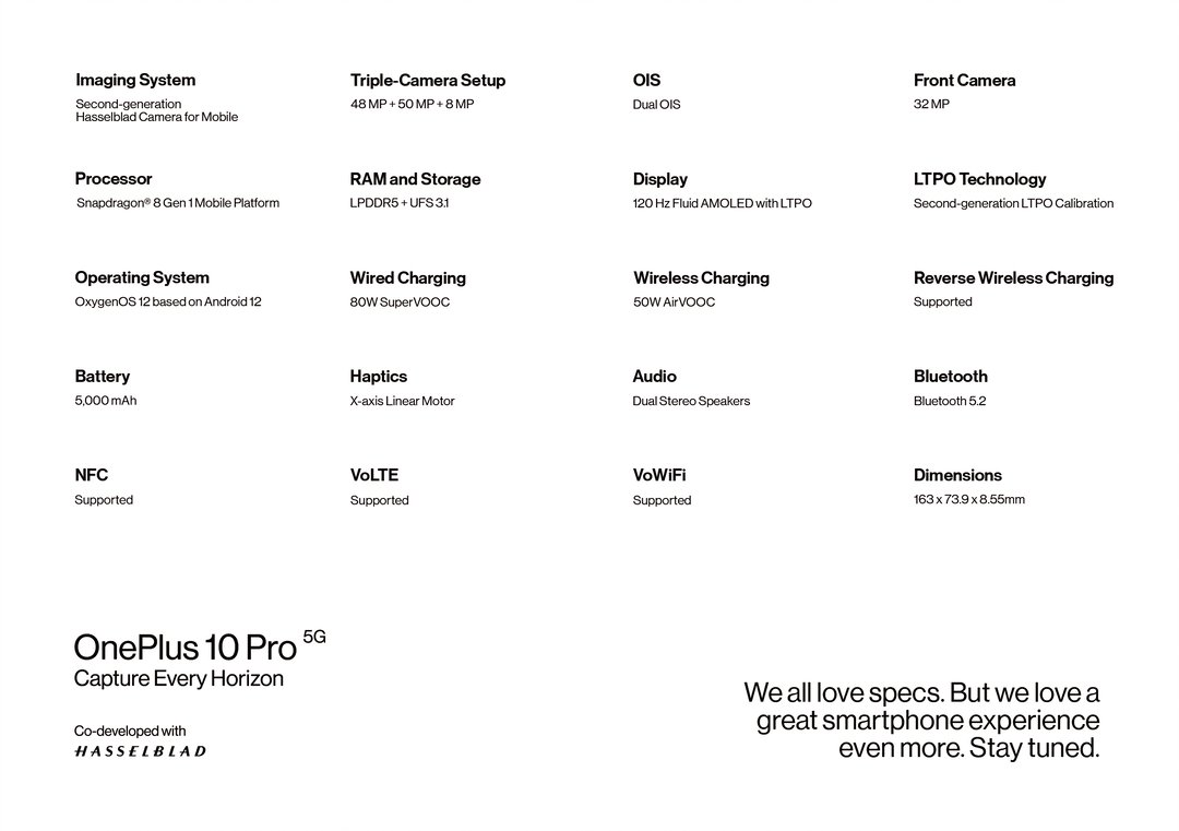 Además, el OnePlus 10 Pro ofrecerá un procesador Qualcomm Snapdragon 8 Gen1 de gama alta, RAM LPDDR5, almacenamiento UFS 3.1, parlantes estéreo, NFC, Bluetooth 5.2 y sistema operativo Android 12 con una carcasa patentada OxygenOS 12. Carga por cable SuperVOOC de 80 W, Carga inalámbrica rápida AirVOOC de 50 W y carga inalámbrica reversible.