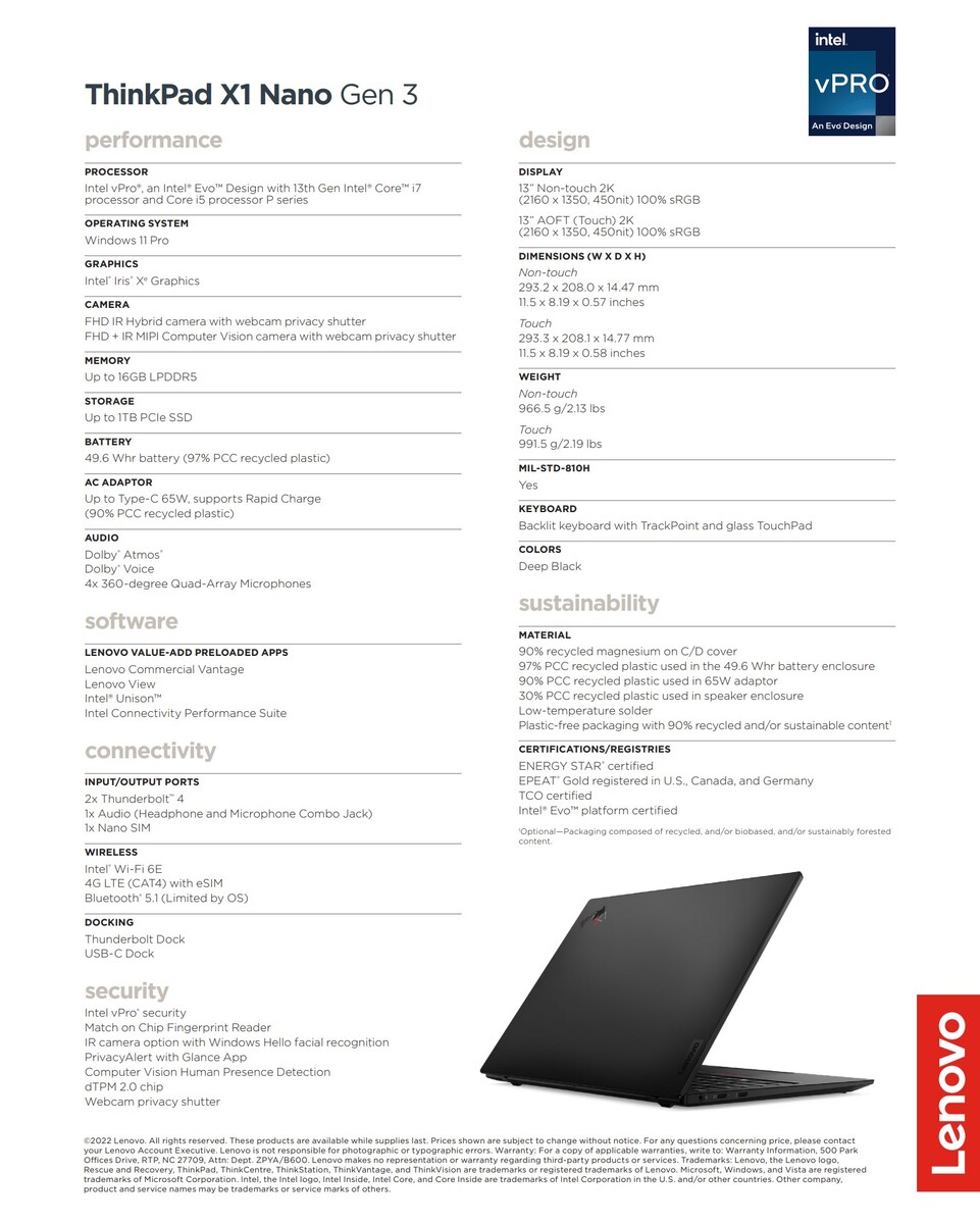 Otra novedad es Lenovo ThinkPad X1 Nano Gen 3. Aquí también se utiliza Core i5 / i7 serie Raptor Lake-P. Opcionalmente, el modelo estará disponible con soporte para redes LTE. La cantidad máxima de RAM es de 16 GB y el SSD es de 1 TB.