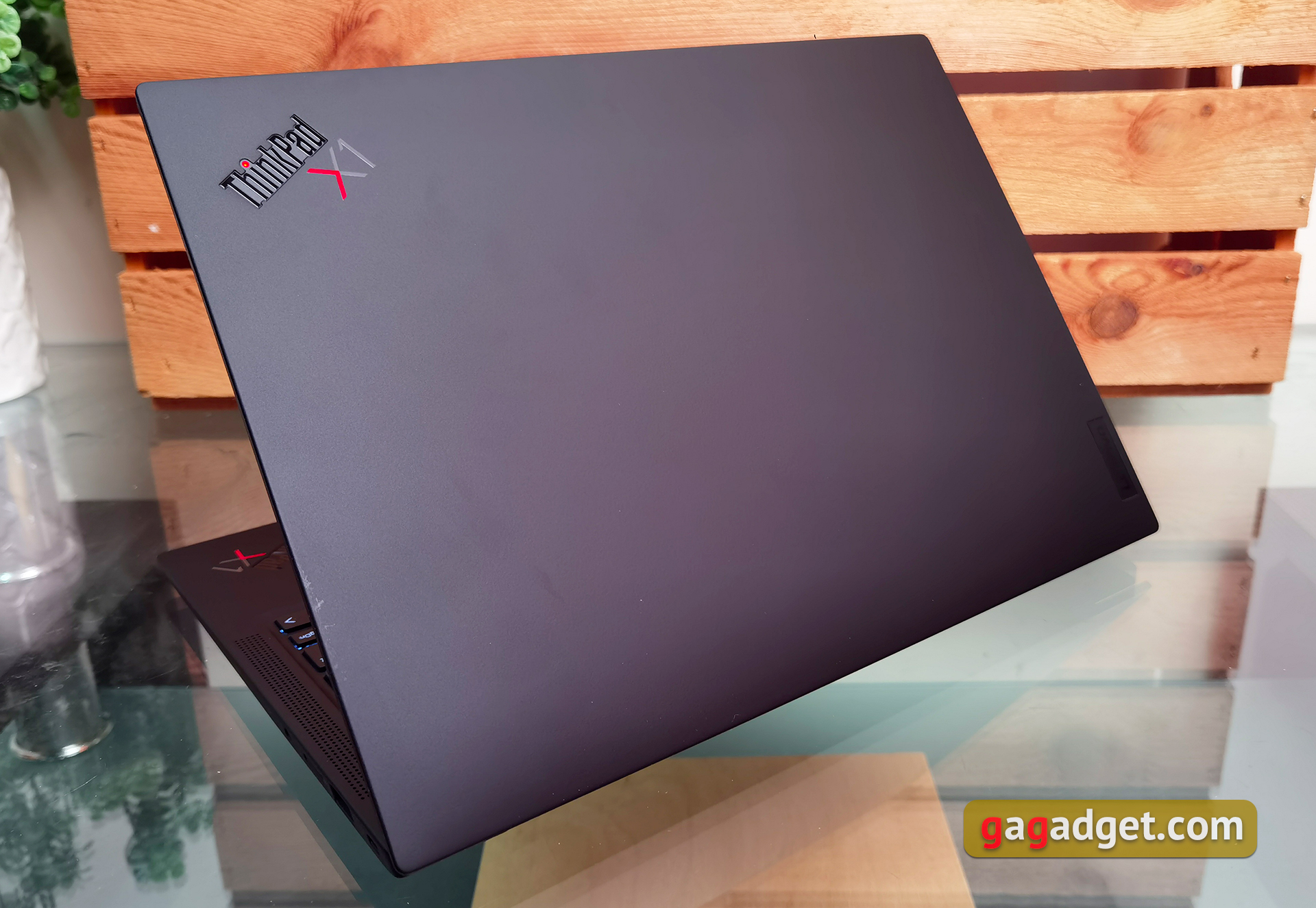 La carcasa sigue siendo de aleación de magnesio y fibra de carbono. Gracias a estos materiales, la carcasa es muy duradera y ligera. El portátil está disponible en dos opciones de diseño: con una textura de fibra de carbono, o una tapa negra más familiar con un acabado mate, muy similar al Soft Touch. Nosotros teníamos esta última opción. Tiene un aspecto y un tacto muy agradables, pero recoge un poco las huellas. Hay un pequeño logo de Lenovo en la esquina inferior derecha de la tapa superior, y un logo ThinkPad con un indicador LED rojo en la parte superior izquierda.