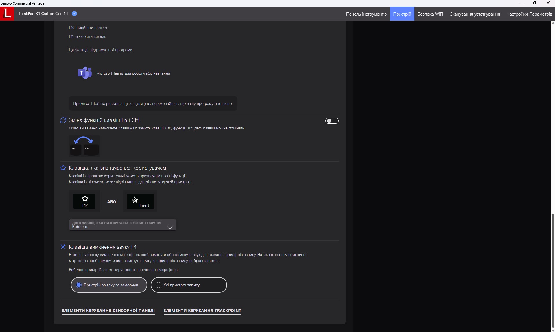 La unidad de teclado está ligeramente empotrada en la superficie de trabajo. Hay altavoces en los laterales, aunque esto no afecta a la distribución, es absolutamente estándar en la línea Lenovo ThinkPad X1 Carbon, así que todo resultará familiar a los entendidos. Y para aquellos que acaban de decidir cambiar a ThinkPad, habrá algunas cosas a las que acostumbrarse. Hay botones Home, End y Delete separados al final de la fila superior, el bloque de flechas está ligeramente desplazado hacia el usuario, y los botones PgUp y PgDn están situados a los lados de la flecha hacia arriba. PrtSc está situado entre los botones Alt y Ctrl derechos. Y una característica tradicional: Fn y Ctrl izquierdo se han intercambiado. Pero esto se puede configurar en la aplicación Lenovo Vantage.
