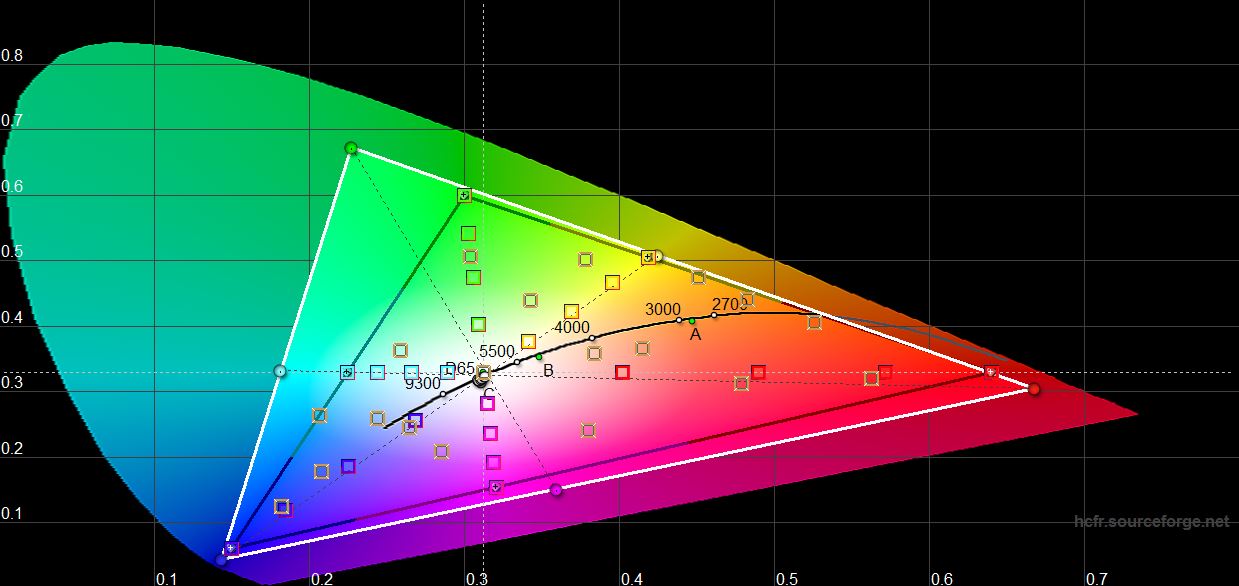 Aparte del hecho de que la arruga en la pantalla se mantuvo, no hay otras quejas. La imagen es muy saturada y brillante, y los ángulos de visión son máximos. En el modo "Brillante" el brillo máximo es bastante impresionante 681.478 cd/m2, con lo que la reproducción del color es muy precisa, cercana a los valores de referencia. Y la gama de colores es mucho más amplia que la de sRGB.