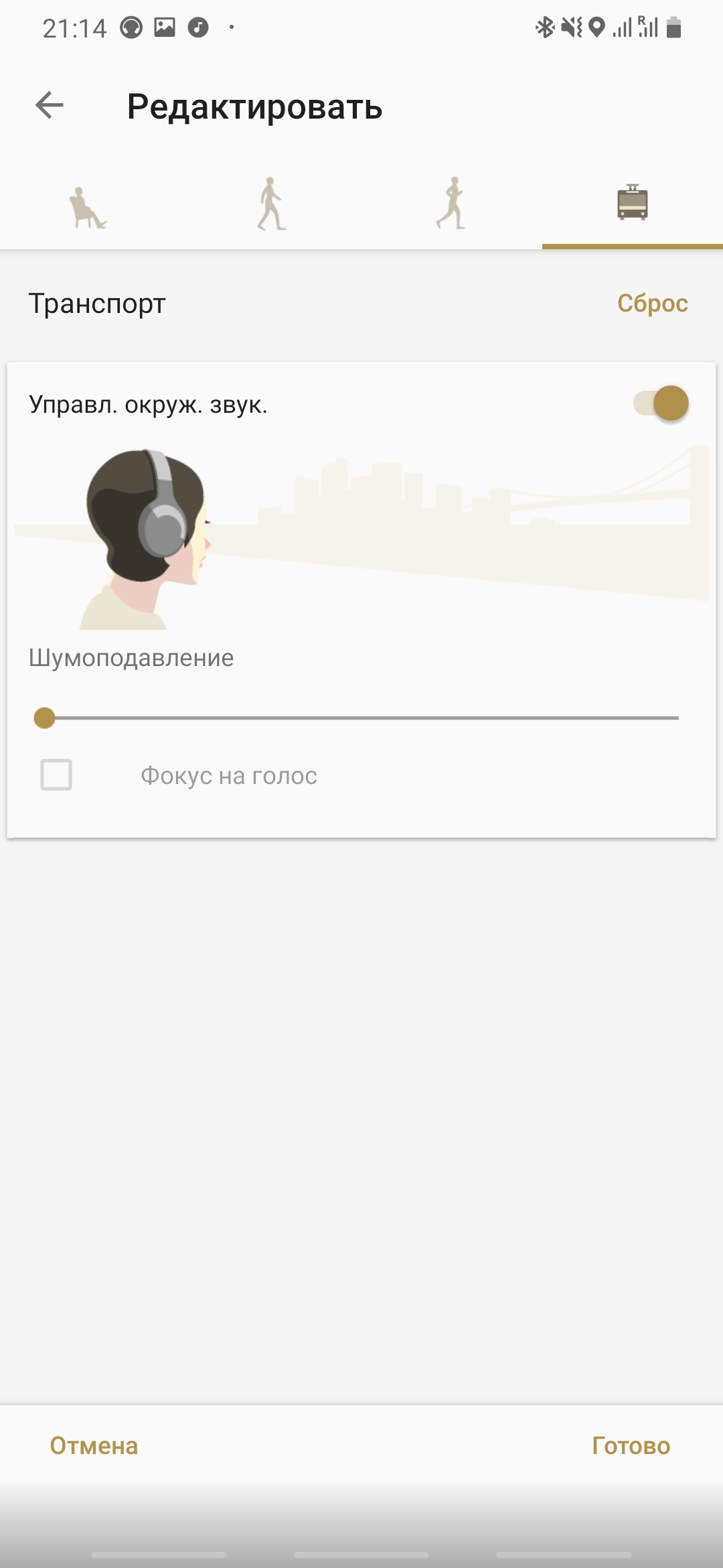 Inicialmente, me sentía completamente cómodo con el modo predeterminado, probablemente porque no había una necesidad particular para la aplicación. Después de la instalación, probé otros modos. Por ejemplo, puede ahogar las voces o el sonido de los vehículos más / menos. Seguramente hay usuarios cuyo estilo de vida requerirá un ajuste tan fino, pero preferí dejar la reducción de ruido al máximo y simplemente escuchar música más tranquila. Entonces, aún se pueden escuchar sonidos especialmente fuertes y puede reaccionar a ellos, pero la carga en el oído es menor.